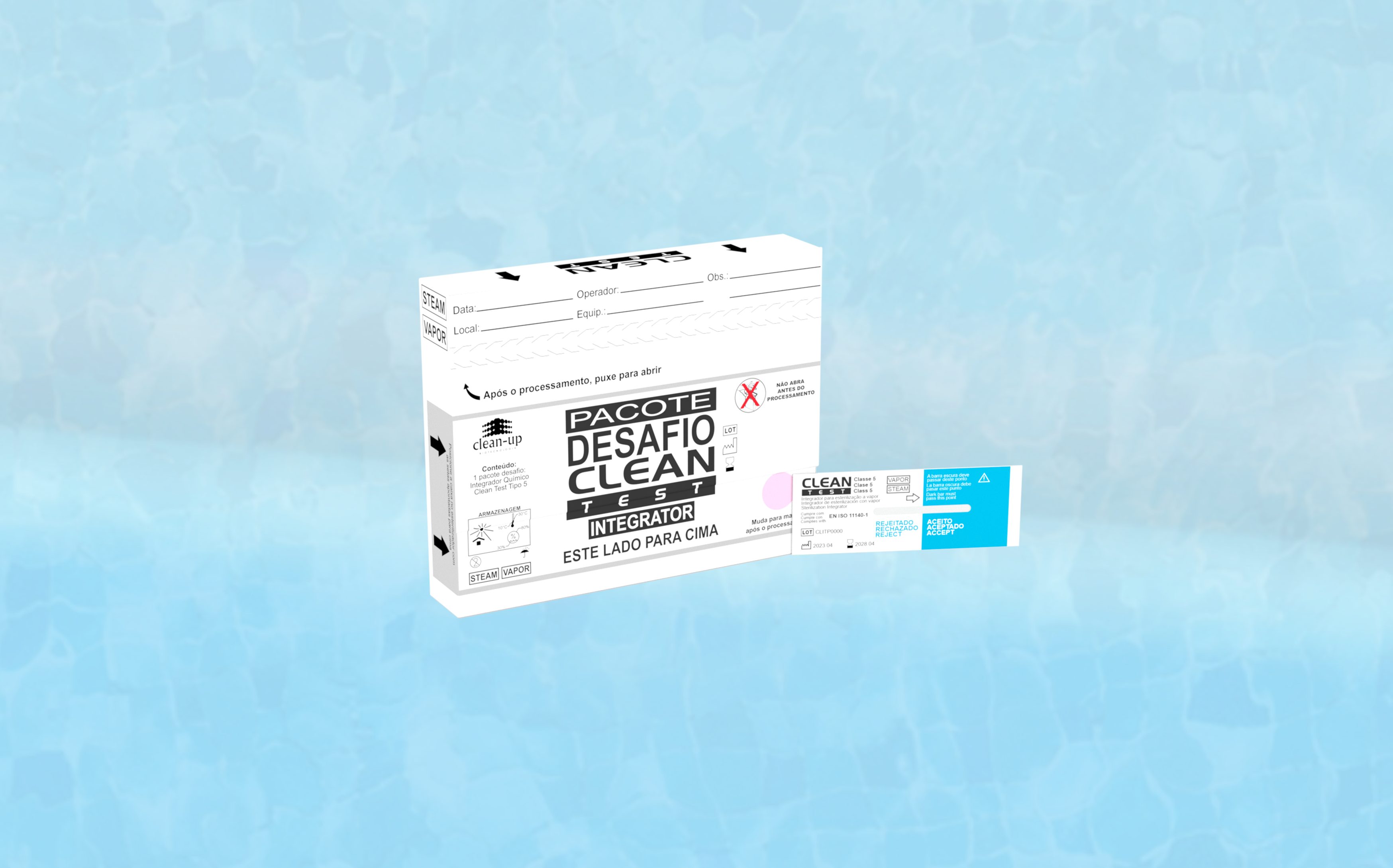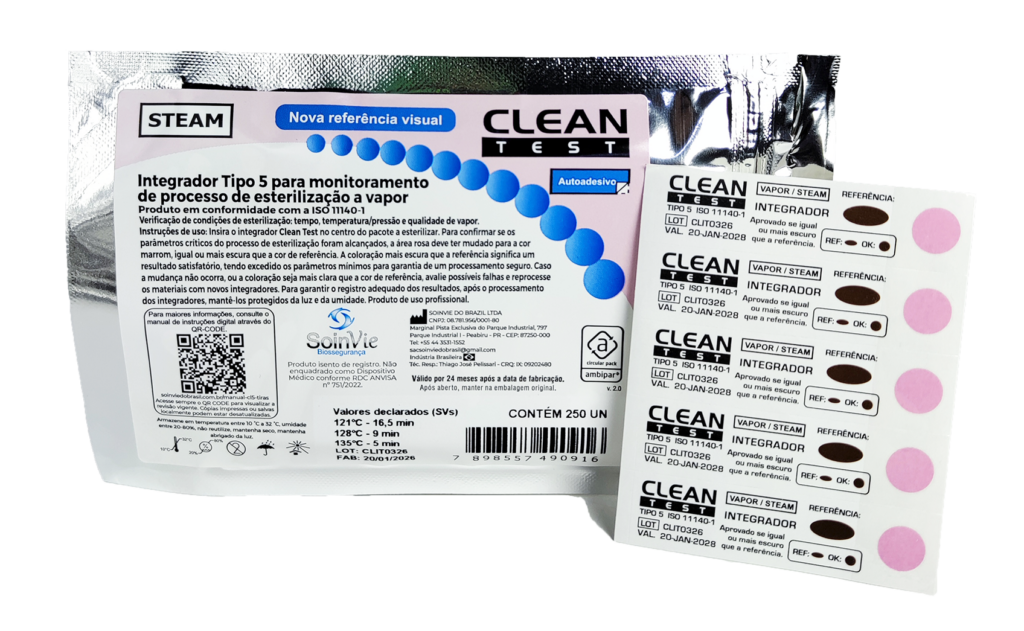 Composto de papel laminado e pastilha química. O Integrador Pastilha Clean-Test foi projetado para integrar as três variáveis críticas de esterilização: tempo, temperatura e vapor saturado. A qualidade do Integrador Pastilha Clean-Test atendem e superam os requisitos contidos em ISO 11140: 2014.